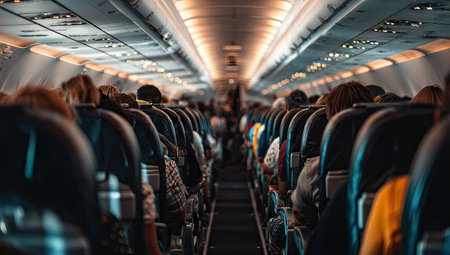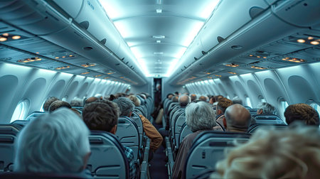 A diverse group of passengers sit comfortably in an airplane, ready to embark on their journey as the aircraft commander oversees the preparations.