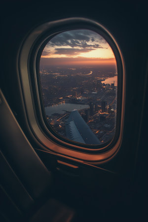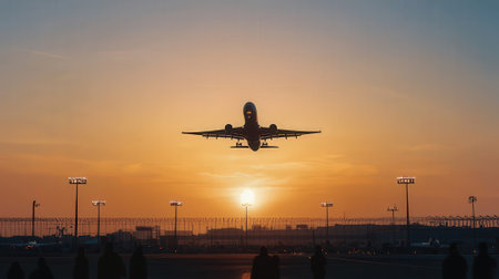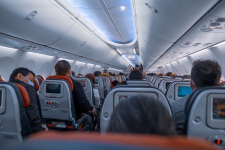 Passengers inside the airliner at sunset are getting comfortable for their journey ahead. The cabin lights are dimmed, creating a relaxing atmosphere for the passengers to unwind and enjoy the flight. Generative AI