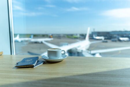 Cup of tea in airport's business lounge with passports. Waiting for the flight. Airplan on the backround