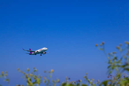 Phuket - Thailand ; February 19 ,2019 : Thai Smile airplane landing at Maikhao beach by the tree is a foreground