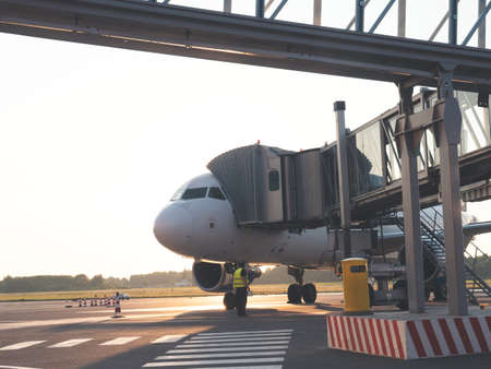 Airplane with terminal gangway of the airport building on sunset. Maintenance of aircraft before the flight