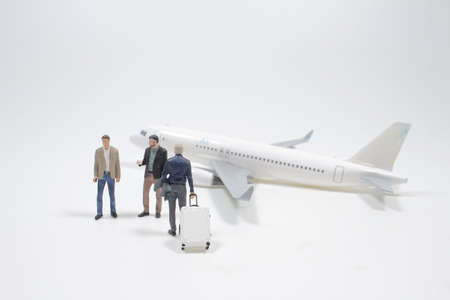 Miniature people toy photography. Travel flight ban concept, Backpacker and hiker traveller figure at the airport fail to fly using airplane. Image photo
