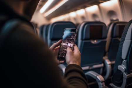 Vertical close-up of hands photographing an airplane window with a cell phone, with copy space.