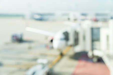 airplane waiting for departure in airport terminal, blurred horizontal background with rain drops. Vacation and travel concept