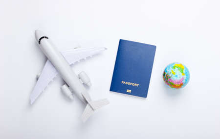 Tourism and travel concept. Globe, passport, passenger plane figurine on white background. Top view. Flat lay