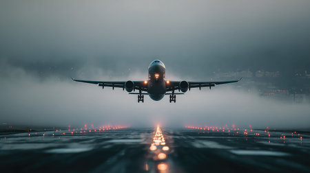 Plane ascending through morning mist and fog after liftoff from wet runway
