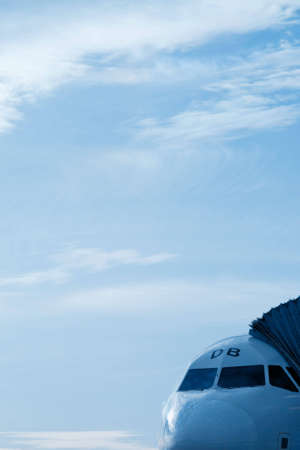 Jet bridge after commercial airline take off at the airport and the plane flying in the blue sky and white clouds. Aircraft passenger boarding bridge docked. Departure flight of international airline.
