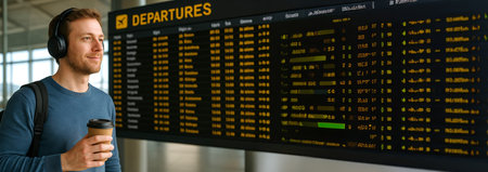 Caucasian man with headphones holding coffee at airport departures board. concept of travel, exploration, modern lifestyle, anticipation, journey preparation, Copy space, Wide banner.