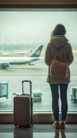 Back view of young traveler woman with suitcase standing in airport terminal. Generative AI