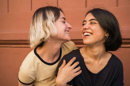 Portrait of happy lesbian couple spending time together and hugging at the street. LGBT concept.