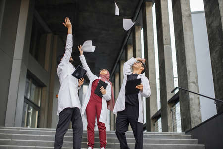 Healthcare and success concept. Three excited young multiethnic doctors colleagues, throwing up papers and smiling with happiness, standing on stairs outside modern clinic