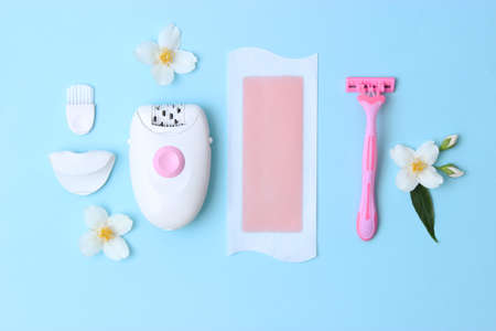 Different supplies for hair removal on light background