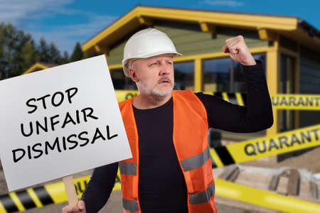 Builder lost his job due to quarantine. Sign stop unfair dismissal on the banner. Builder holds a banner in his hands. Concept - reduction of employees due to quarantine. Quarantine led to protests