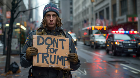 Elderly man with glasses and a red cap stands amidst a diverse group of protesters in a city, expressing his views in cold weather. The crowd shows unity in a peaceful demonstration for change.