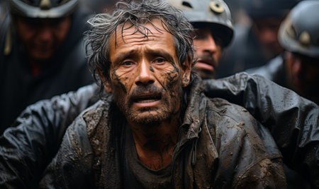 A middle-aged man stands near a burned-out building, his face revealing exhaustion and resilience. Mud covers his shirt and face as he faces a scene of scattered debris and make tentshifts.