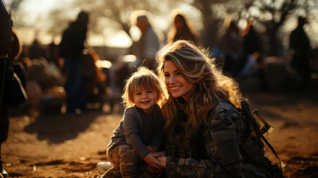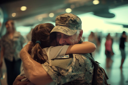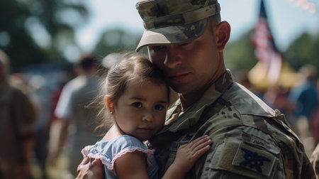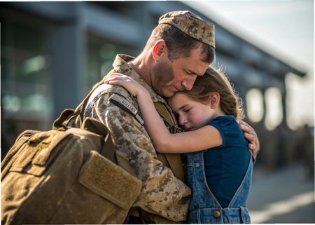 Soldier holds young girl close in a touching reunion, highlighting deep emotional bond and connection, set against a blurred background of military environment