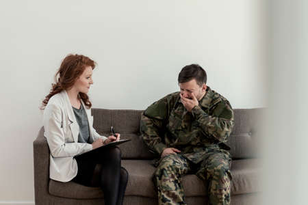 Young psychotherapist taking notes while listening young veteran who talking about his problems.