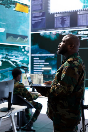 Military officer participates in a secure videoconference call in modern command center, transmitting live satellite information. Federal collaboration for national security operations.