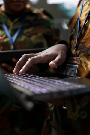 Young multiethnic female military officer in camouflage uniform looking through data on laptop screen while working among male colleagues