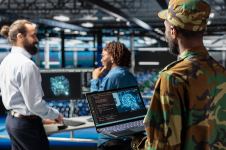 Army technicians in command center server farm using artificial intelligence to detect cyber threats. Military data center IT experts use AI detection software to secure defense systems.
