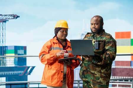 Soldier working with offshore installation manager to deter insurgent attacks. Military unit boarding drilling barge under maritime interdiction protocol, cooperating with technician