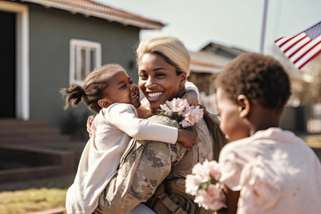 Portrait of happy multiracial soldier with woman and children standing at entrance of house. Unaltered, family, togetherness, childhood, military, patriotism and homecoming concept.