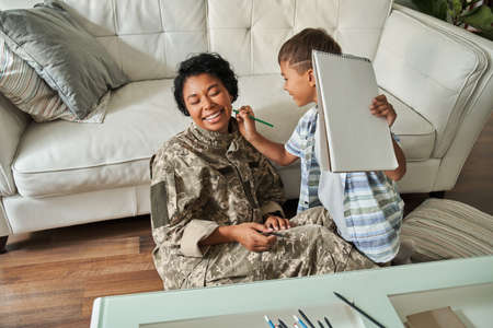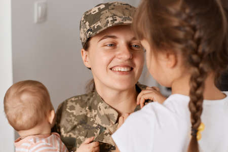 Closeup portrait of smiling optimistic military mother wearing camouflage uniform and hat, meeting her daughters when homecoming after military served.