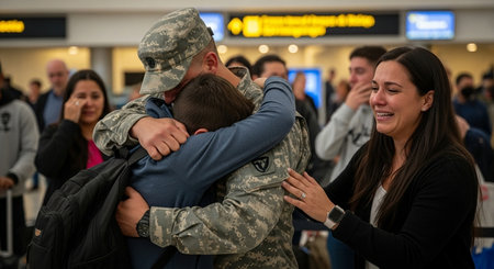 A heartwarming reunion at an airport where a veteran embraces his children, with tears of joy and relief.