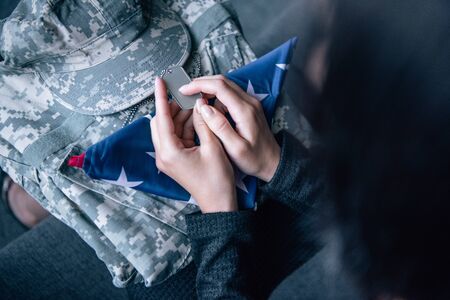 cropped view of woman on couch with military clothing, tag dog and foded american flag at home