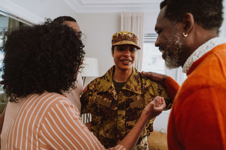 Us Veteran woman leaving for military service. Young female soldier leaving and greeting the family after the holidays.