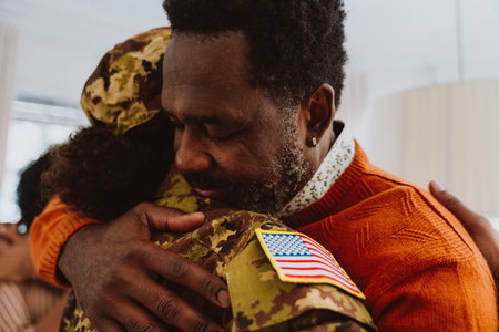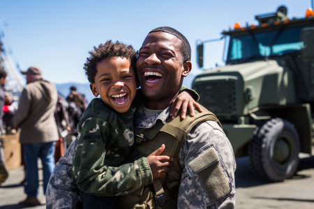 Touching military reunion father and son embrace in a heartwarming display of affection