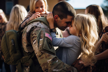 Affectionate military reunion between father and daughter, Father hugging child. Generative AI.