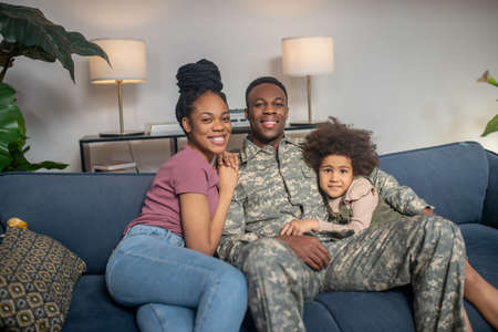 Rear view close up of a young adult African American soldier embracing his young daughter and his mixed race wife