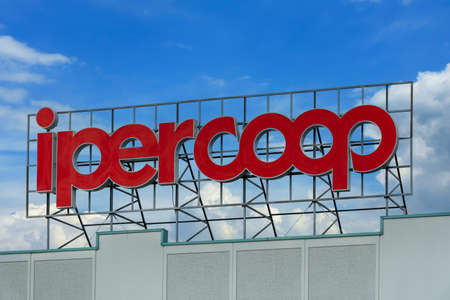 Cuneo, Italy - June 03, 2022: Sign with logo IperCoop, it is an italian cooperative of consumers and supermarkets of large-scale distribution of food and consumer goods