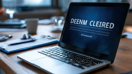 A laptop screen displays the words Deenm Clerred on a wooden desk. The laptop is open and placed on the desk, which also has a cup and a pen. The scene suggests a work or study environment