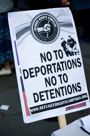 London, United Kingdom, November 17th:- Anti deportation placard at the Stand Up To Racism march through central London from the BBC to near Downing Street in Whitehall