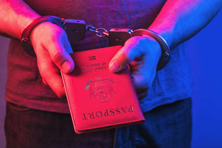 Hands in handcuffs with an American passport, the concept of punishment for fake documents