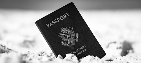 Black and white American passport in sand closeup