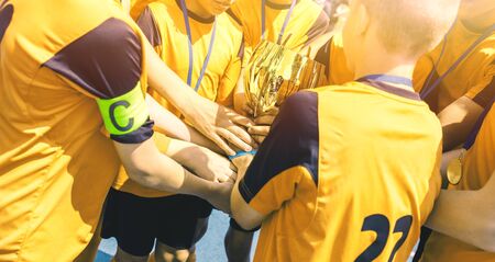 soccer players team group celebrating the victory and become champion of game while holding win coup