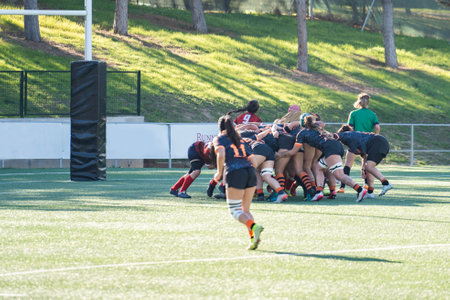 Tense moment of girls rugby fight . Dramatic challenging game for womens rugby team in match day