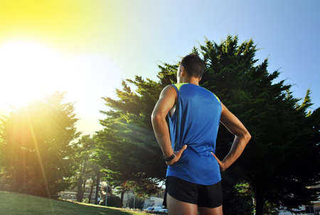 Taking a moment before going at it again. a handsome young man taking a moment to catch his breath during his outdoor run.