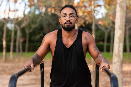 african american athlete boy does calisthenics fitness exercises on bars in park