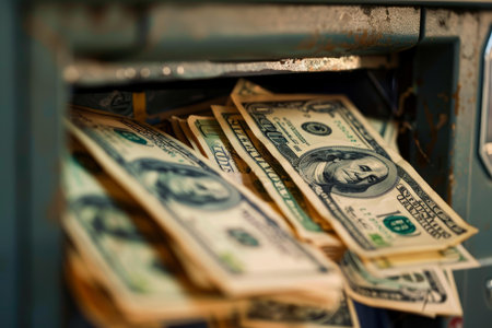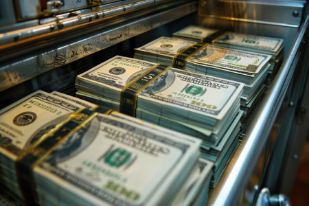 Close-up of stacks of US dollar bills neatly arranged in a cash drawer, emphasizing financial security and cash management.