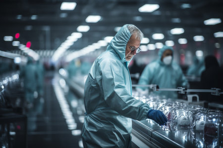 Workers producing surgical mask in modern factory, protection and medical concept.