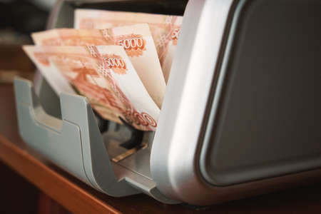 Russian banknotes five thousand rubles at the currency counter machine