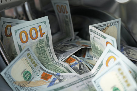 Us dollar banknotes in currency counter machine. Bank automated equipment for counting money. Exchange currency in bank office. Close up of paper money calculation, business concept