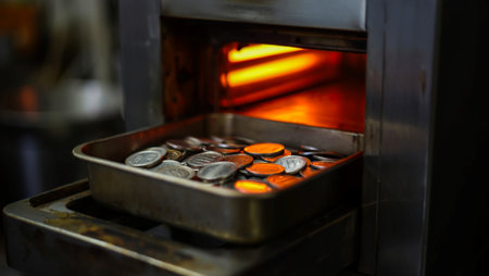 Coins in the oven. Saving money concept. Selective focus.