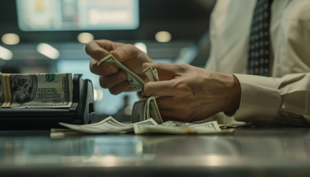 Bank teller counting dollar banknotes with precision and clarity in high quality image