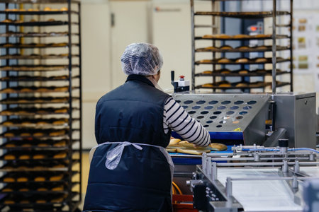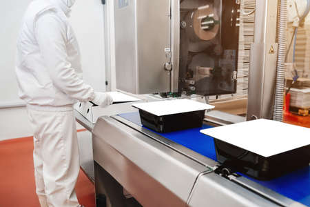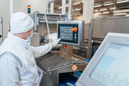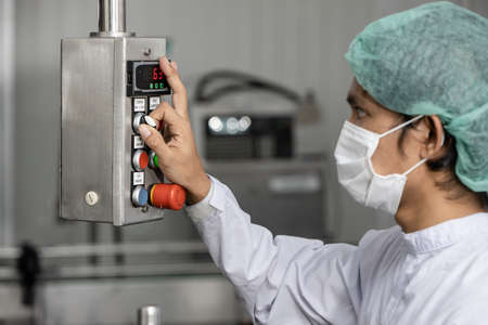 Staff workers working operate control machine in hygiene food factory.
