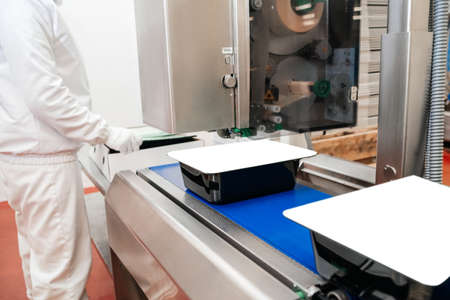 People working.Chicken fillet production line.Production process, packaging on the conveyor line of meat in boxes.Conveyor Belt Food.Automated production line in modern food factory.